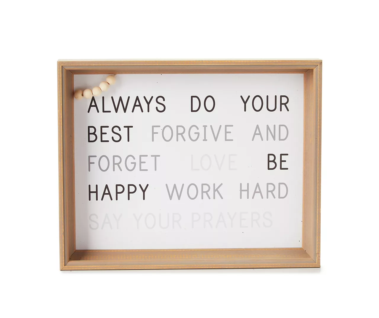 Bring a level of charm and style to your home with this beautiful framed plaque. Boasting a lovely white color, charming beaded accent and the encouraging “always do your best, forgive and forget, love, be happy, work hard, say your prayers” message, this plaque is a beautiful piece of decor that will go with any home’s aesthetic. Whichever room you choose to place it in, you’ll find that your entire home’s look has been effortlessly elevated.