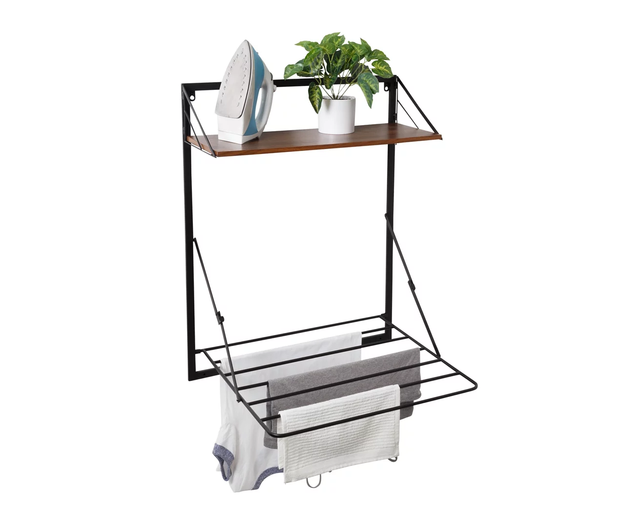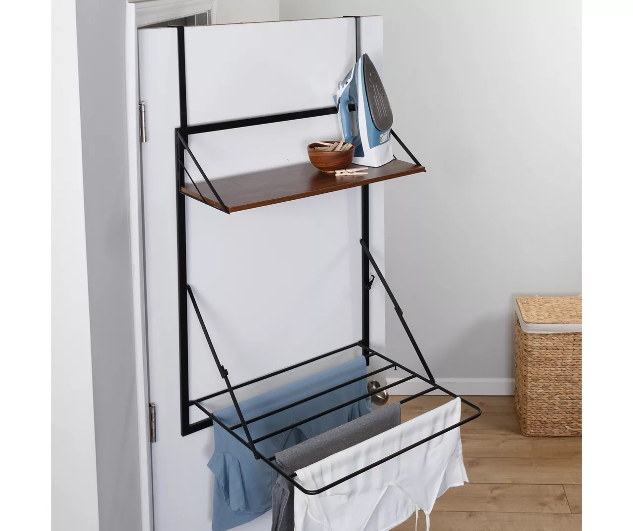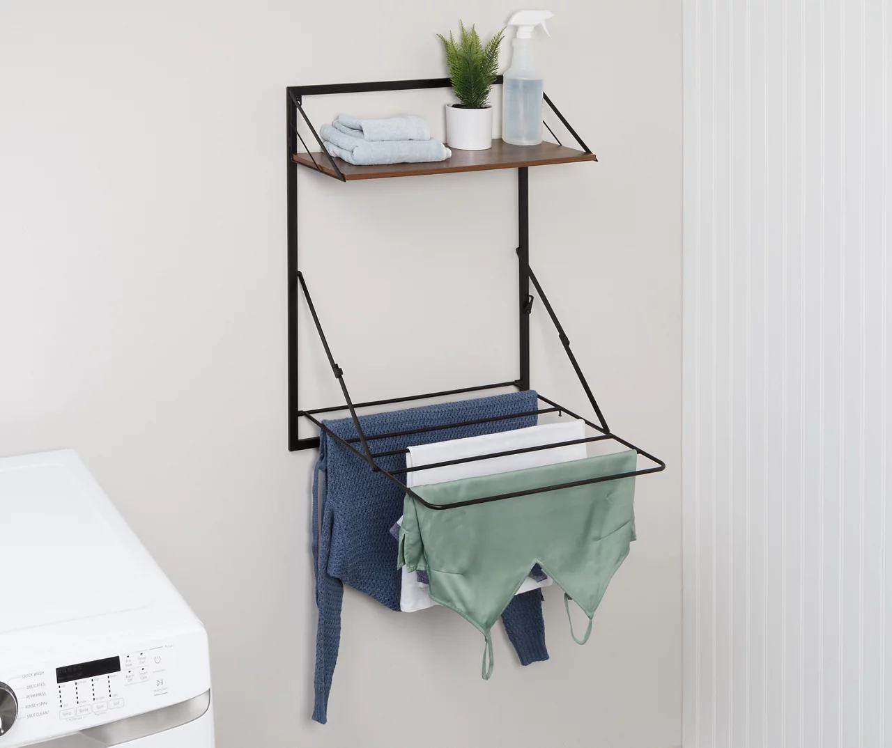 This elegant storage solution from Honey-Can-Do pairs a retractable drying rack for clothes with a timeless top shelf to organize laundry essentials or show off your style. While the sleek wood-shelf will always be on display, the laundry rack extends out only when you need it and saves space by folding up to the wall. If you’re short on wall space, this handy unit comes with door hanging hooks that instantly convert it into an over-the-door drying rack for even more storage options.