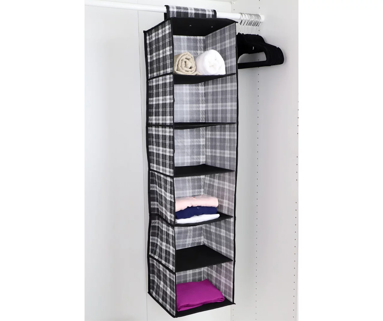 Declutter your closet and maximize your space with the help of this hanging closet organizer from Home Basics. It features sturdy metal hooks that allow you to hang it on most standard closet rods. Simply unfold the organizer to reveal vertically arranged cubbies fit for organizing your entire wardrobe. Use each compartment to stow away folded clothes, accessories or shoes. Constructed from breathable non-woven material, the organizer is gentle on even the most delicate garments. The organizer also folds down into a flat square, allowing you to tuck it away in a drawer or under a bed when you’re done using it.