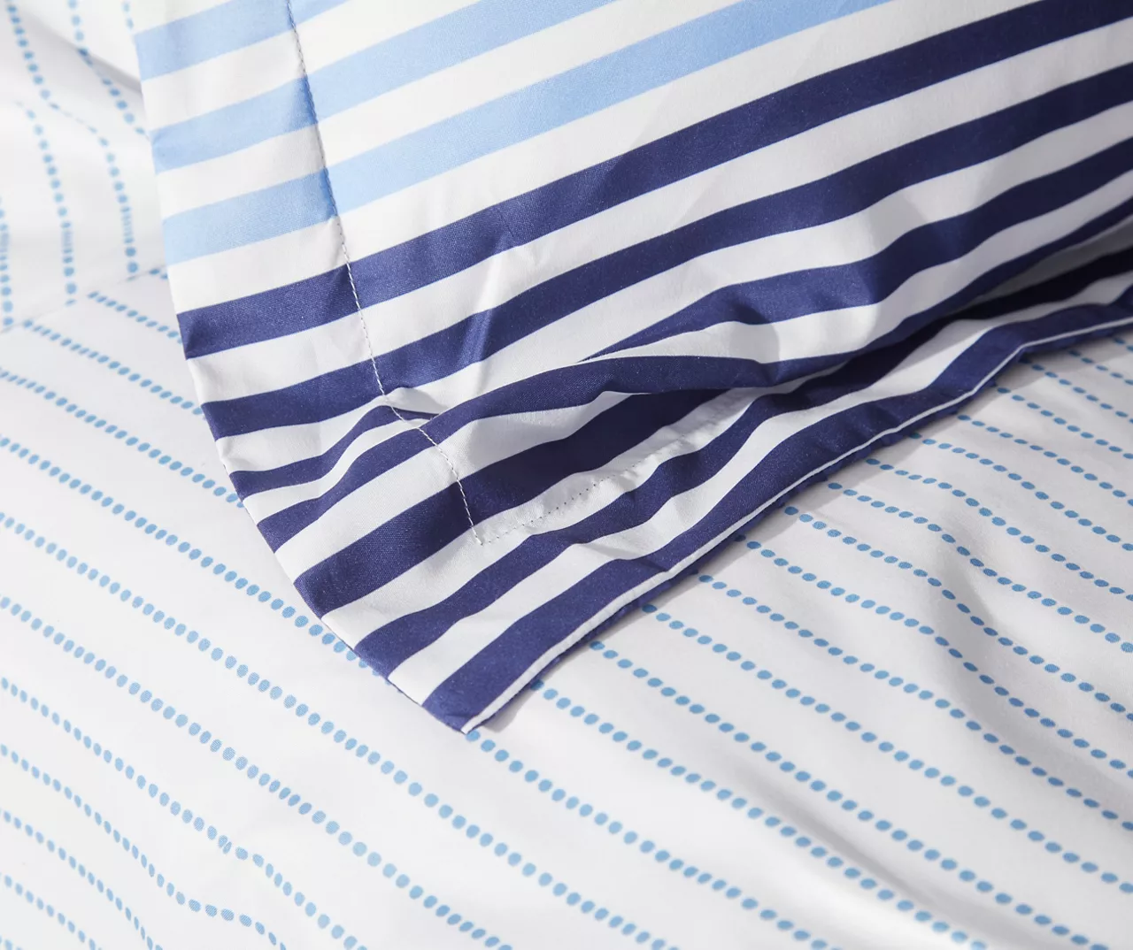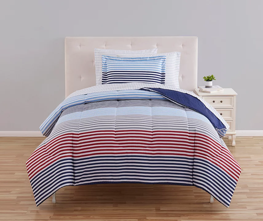 Refresh a kids’ or guest bedroom from headboard to footboard with the bright blue, red and white stripes of this all-in-one bedding set from Real Living. Soft microfiber fabric is sure to keep you cozy and comfy through the night.