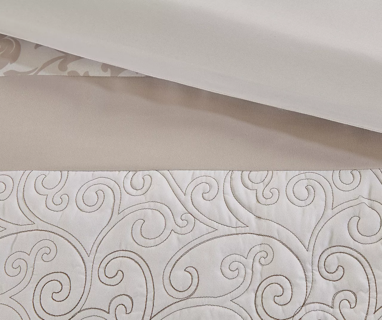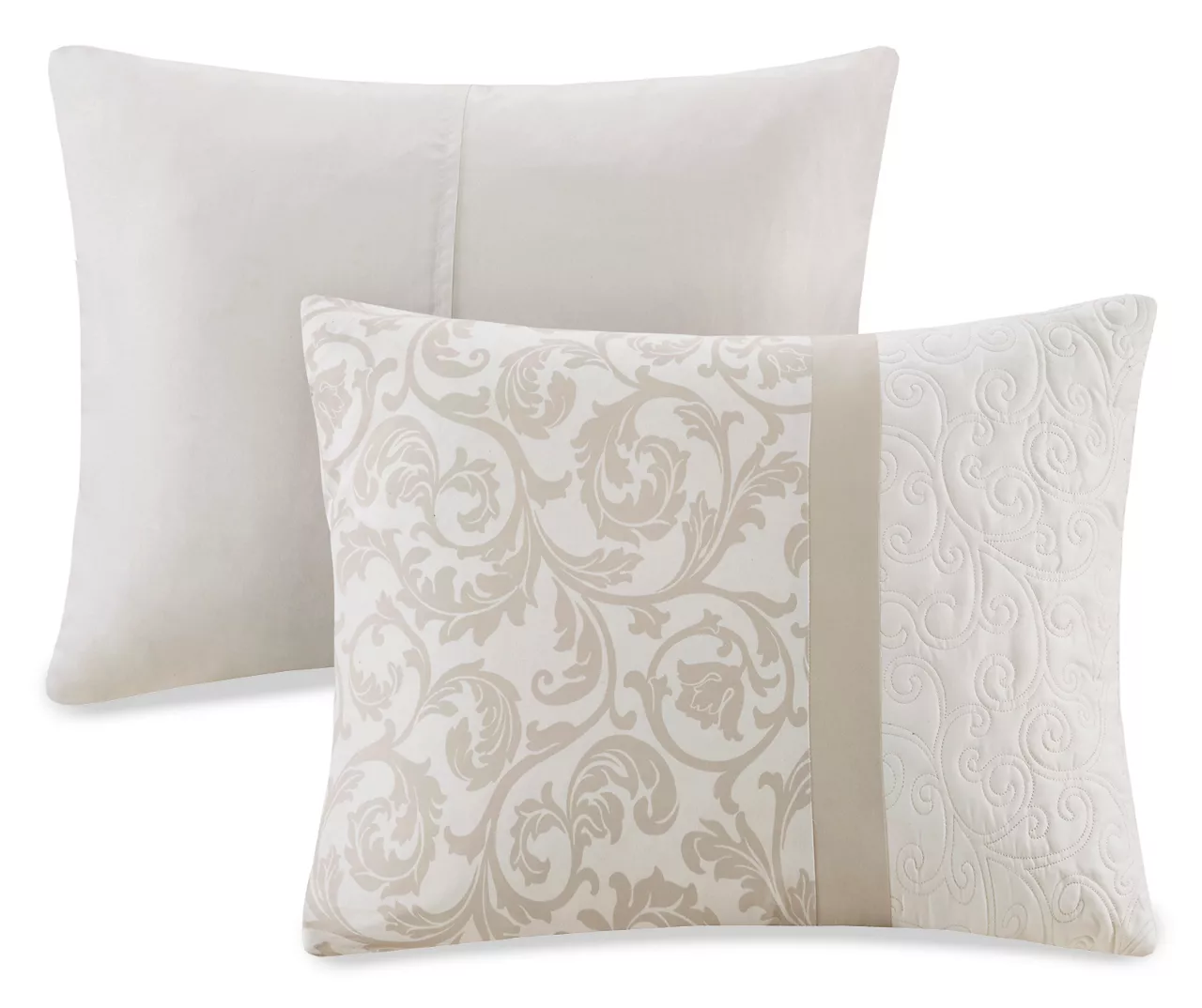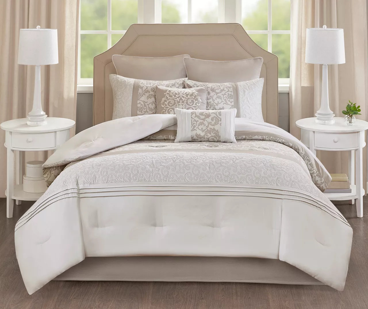 The Casey embroidered eight-piece comforter set introduces a graceful elegance to your bedroom décor. A pieced embroidery design with quilting and pintuck details adorns the face of the comforter and shams for a beautiful transitional look. Solid euro shams complement the top of the bed, while two embroidered decorative pillows and a solid bed skirt provide the perfect finishing touches. Made from ultra-soft microfiber, this comforter set is machine washable and offers a charming update to transform your bedroom.