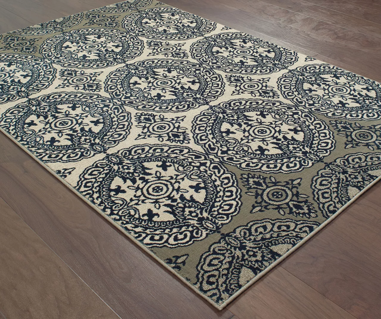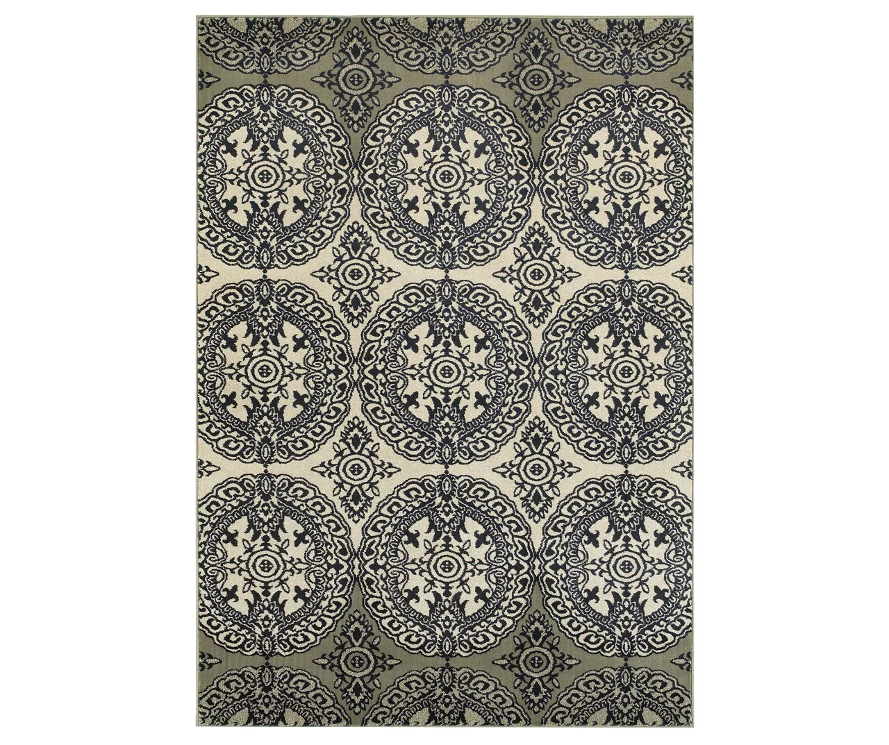 This large rug gives your space a sophisticated and grand presentation in your living room or bedroom. The medallion pattern in navy and ivory complements most furniture while giving your space a whole new look with comfort, texture and dimension.