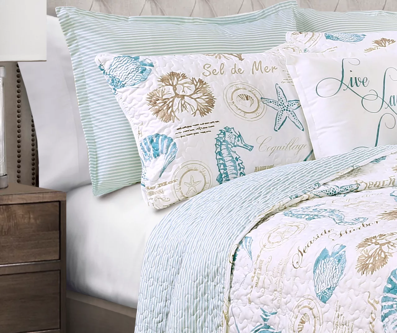 - Quilt: “Seaside harbor”, “sel de mer” and “beach life” messaging in dark taupe font on a white background