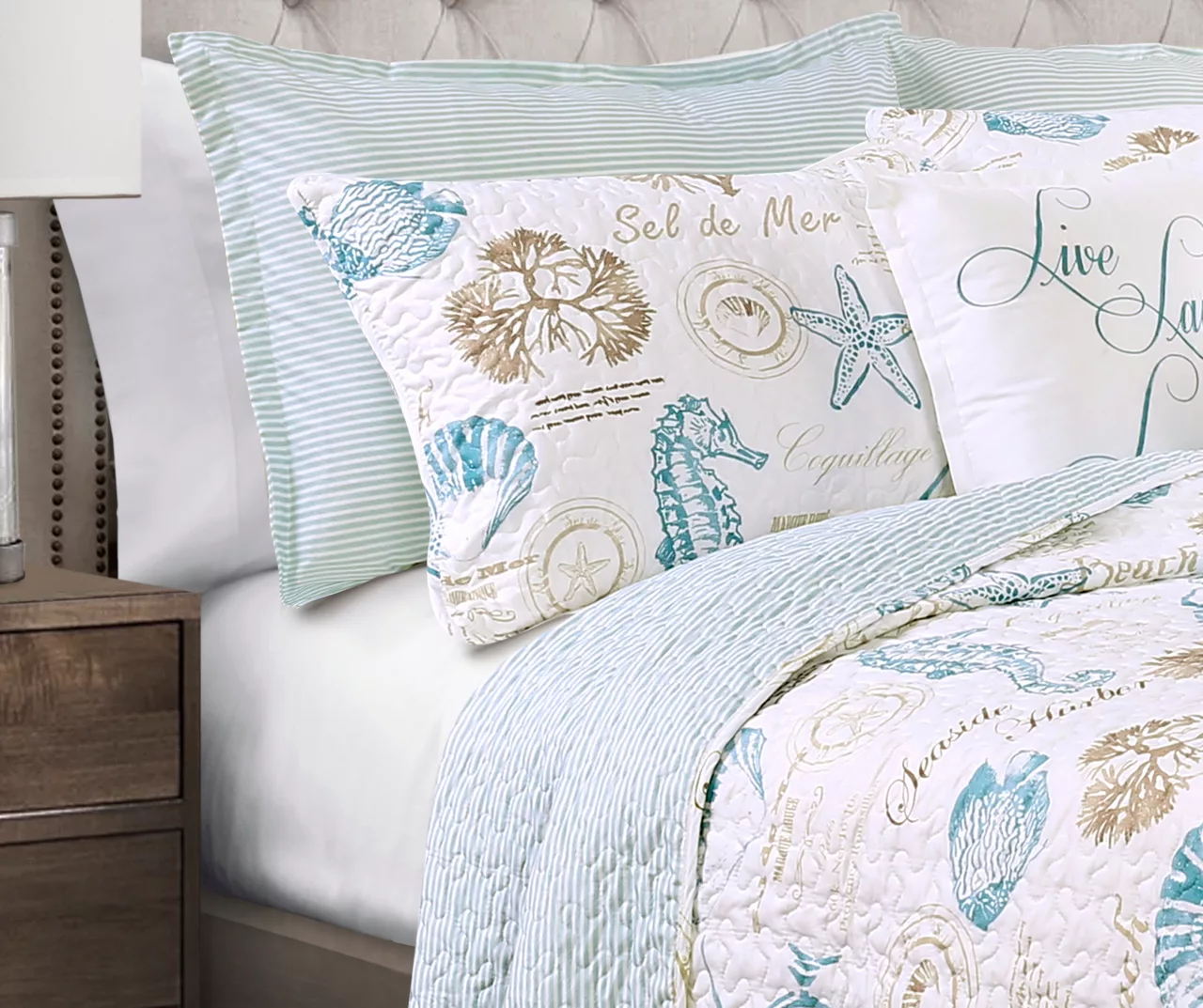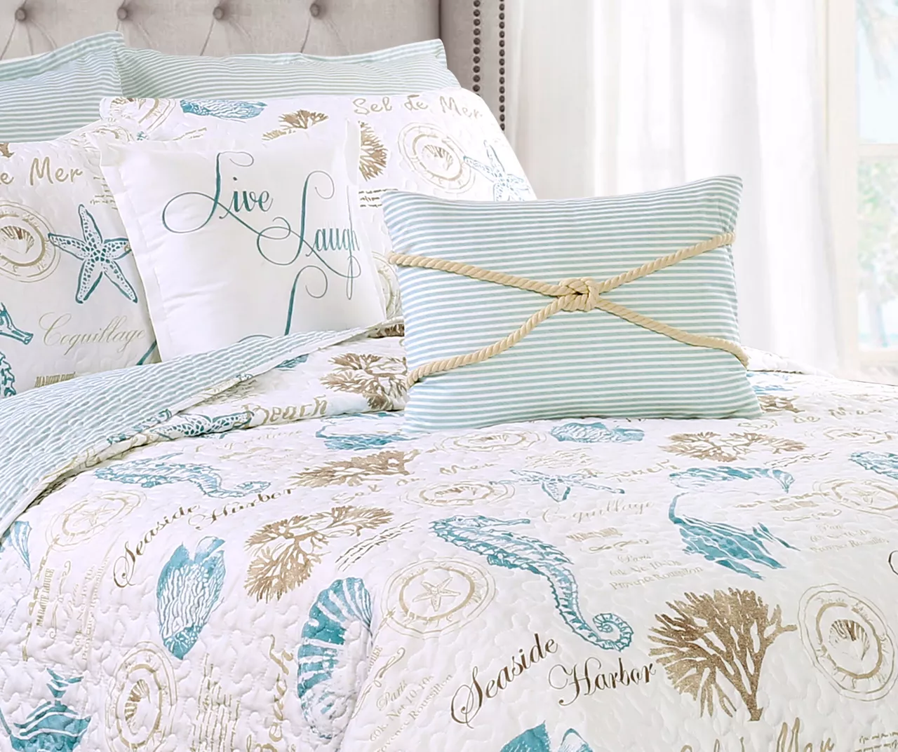 Turn your bedroom into a sea-worthy escape with the coastal charm of this quilt set from Lush Decor featuring a print design filled with ocean life and elegant typography. Coordinating decorative pillows complement the look with rope embellishments. Soft polyester keeps you cozy and comfy through the night.