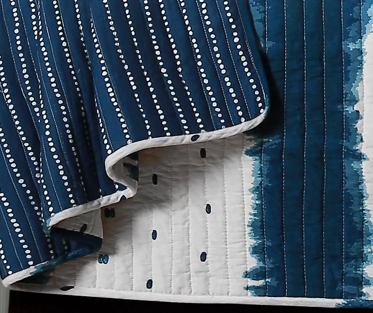 A tie-dye design inspired by the traditional shibori technique lends modern boho style to this quilt set from Lush Decor. Matching shams complete the look and the breathable cotton construction keeps you cozy through the night. The quilt reverses to dotted stripes in white against a deep navy hue so you can switch up your bedroom style on a whim.