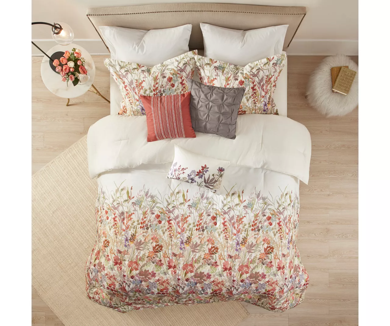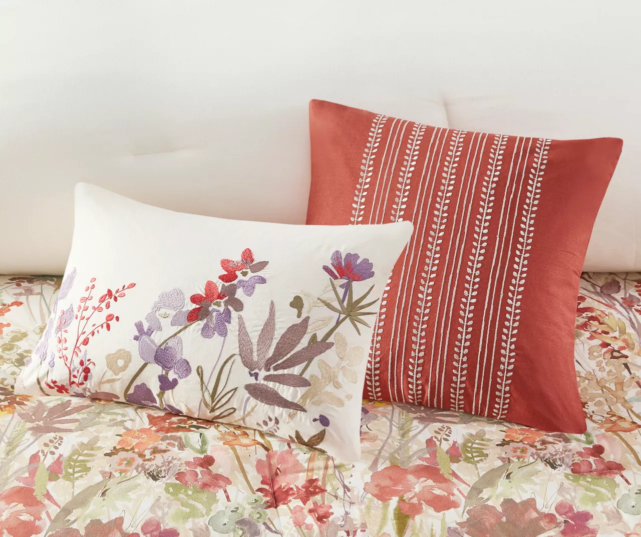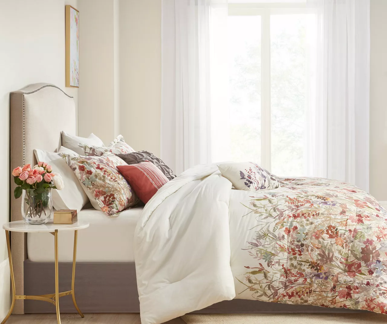 This Julia comforter set brings a touch of beauty to your bedroom decor. This cotton comforter features a watercolor floral print that runs from the middle of the bed to the foot, for a beautiful transitional look. Two coordinating shams pair perfectly with the comforter, while three decorative pillows with embroidery and tufted details provide rich textural accents to the bed. A solid bed skirt adds the finishing touch to complete the comforter set.