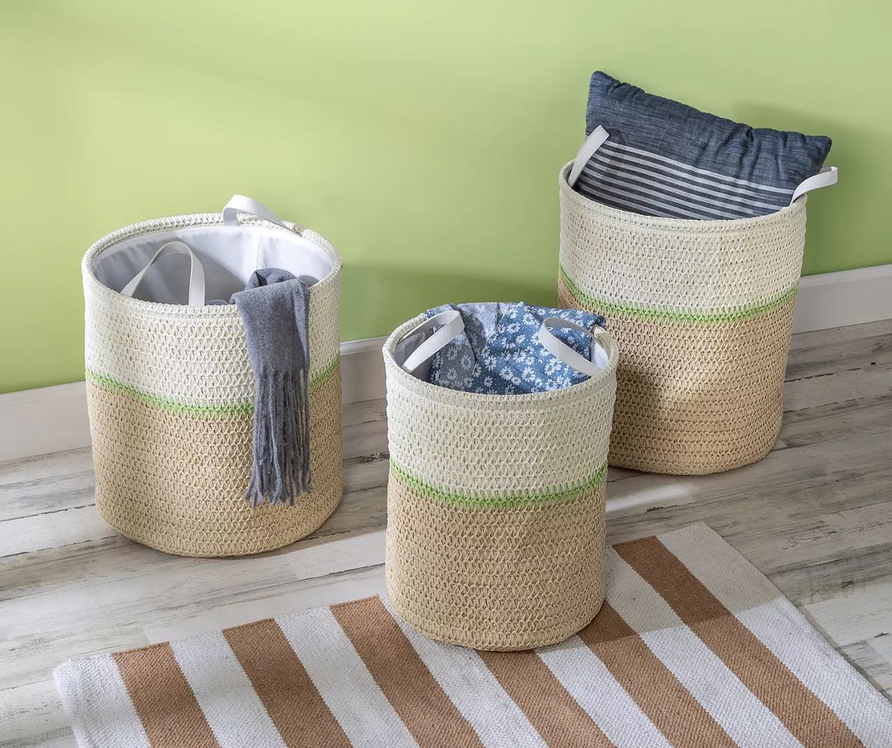 - Baskets can nest in each other for space-saving storage while not in use