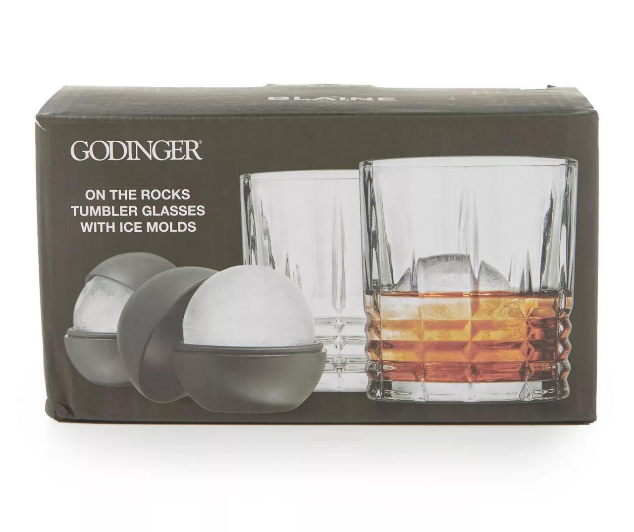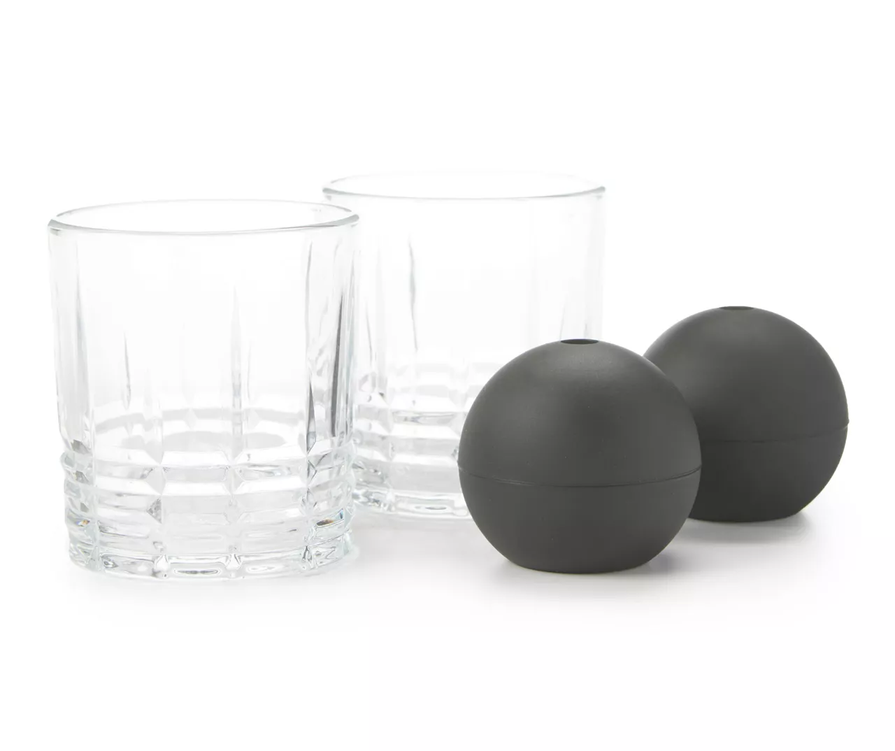 Serve your favorite spirits with the traditional elegance of this glass set featuring a beveled grid design in lead-free crystal. Black silicone ice molds create a large ice ball to give your drinks some slow-melting chill.
