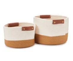 Small Off-White & Mustard Rope Bin With Faux Leather Handles